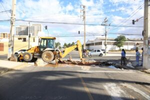 A empresa de saneamento está abrindo o asfalto da Rua Theodomiro, próximo à Faculdade Maurício de Nassau, para consertar o problema na tubulação. Os condutores de veículos e pedestres devem ficar atentos às obras no local.