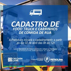 O cadastramento dos interessados em atuar no ramo de food trucks e carrinhos de comida no município termina até a próxima sexta-feira (12). Até agora, cerca de 30 comerciantes já efetivaram o cadastro que está sendo realizado pela Prefeitura de Petrolina com o objetivo de ordenar a atividade na cidade.