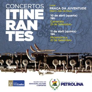 A Praça da Juventude do bairro João de Deus será palco das próximas apresentações do Projeto ‘Concertos Itinerantes’ da Prefeitura de Petrolina. Nesta quarta (10) e quinta-feira (11), a partir das 19h, os moradores da comunidade e bairros vizinhos serão agraciados com espetáculos da Philarmônica e Camerata 21 de Setembro.