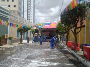 Diariamente cerca de 50 profissionais vão às ruas realizando os serviços de catação, varrição e lavagem das vias e dos banheiros químicos. O trabalho é reforçado pelo caminhão varredeira e caçambas.