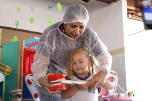 As dentistas fizeram ainda a avaliação da língua das crianças, que estão inseridas nos berçários da rede municipal. O cuidado visa diagnosticar a anquiloglossia, uma anomalia que limita os movimentos da língua. A atenção com a saúde desde a primeira infância ajuda a identificar, prevenir e até tratar problemas que podem se agravar e levar a situações mais sérias na vida adulta. O teste da linguinha é ofertado no no Centro de Referência em Saúde da Mulher, bem como nas Unidades Básicas de Saúde.